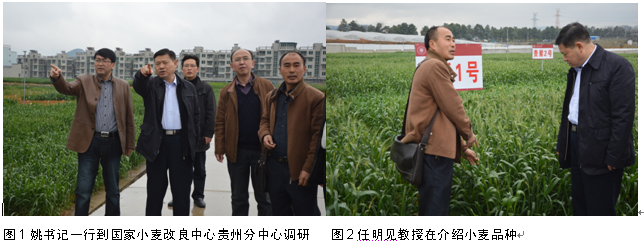 下午3点,姚书记一行首先到了位于学校农场分场的国家小麦改良中心贵州分中心。在实地调研过程中姚小泉书记十分关心威尼斯官网科研成果转化及推广的情况。当走到名为“贵紫一号”的小麦实验区时,国家小麦改良中心贵州分中心主