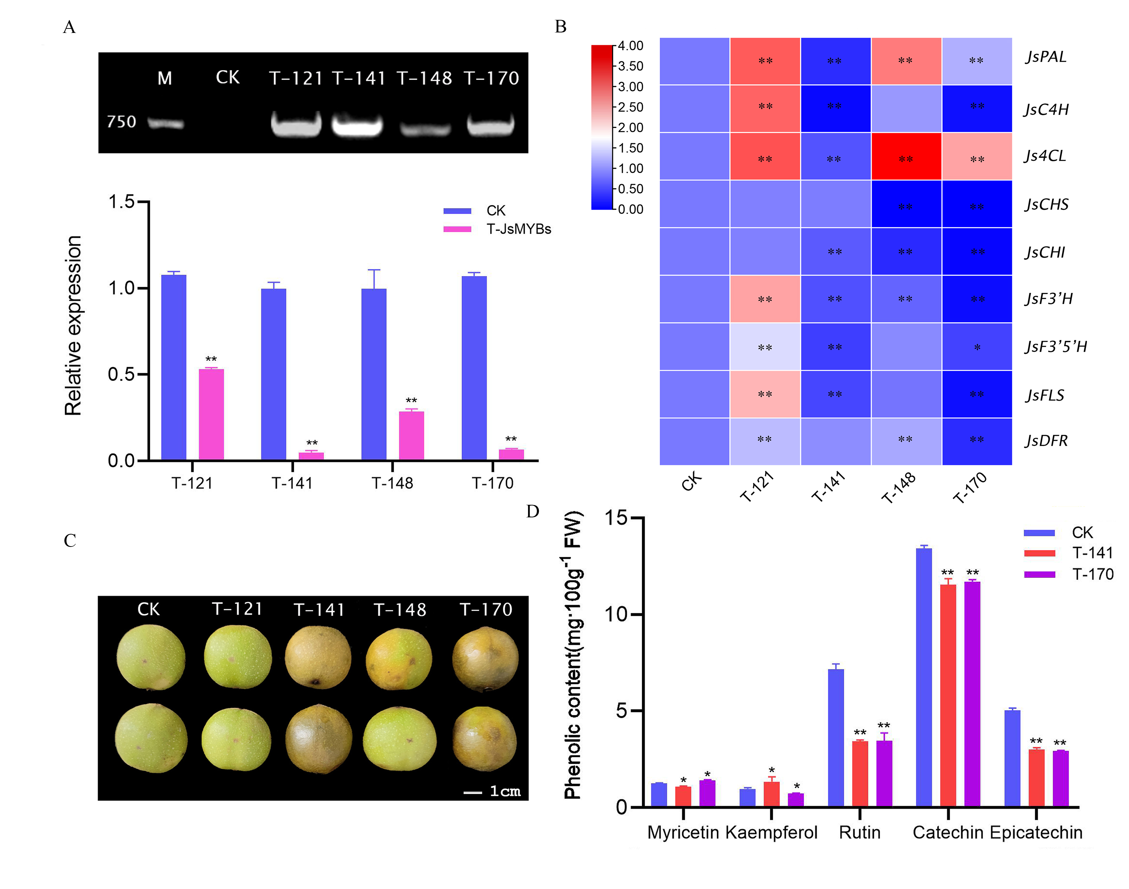 图4泡核桃JsMYB121、JsMYB141、JsMYB148和JsMYB170的青皮沉默