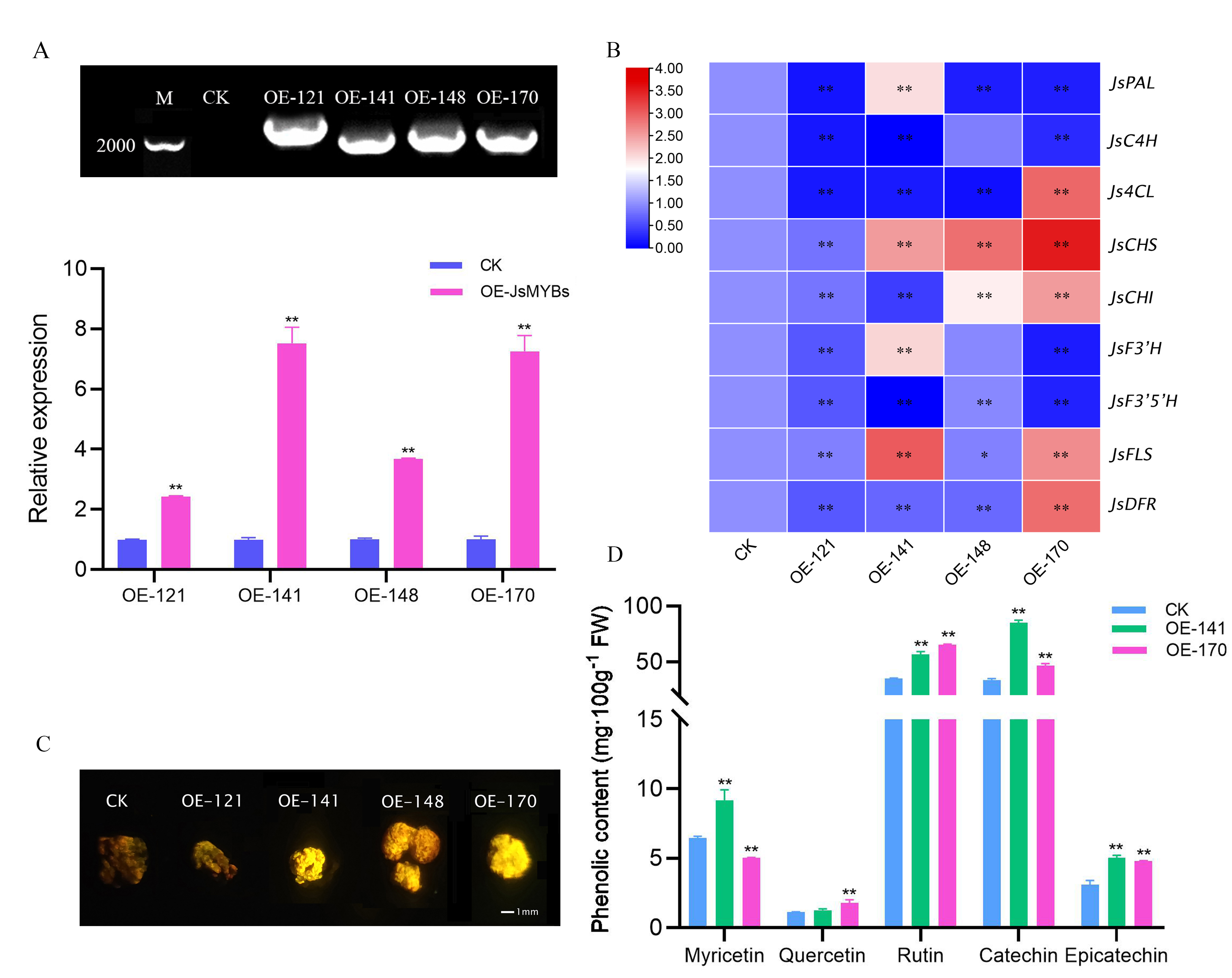 ,芦丁和杨梅素含量极显著上升。在过表达JsMYB170的愈伤组织中,Js4CL、JsCHS、JsCHI、JsFLS和JsDFR的表达水平增加了7倍以上,芦丁和槲皮素含量极显著上升。过表达JsMYB141和JsMYB170的愈伤组织经DBPA染色后出现强烈的橙黄色荧光。这些结果表明,JsMYB141和JsMYB170能提高黄酮醇含量。