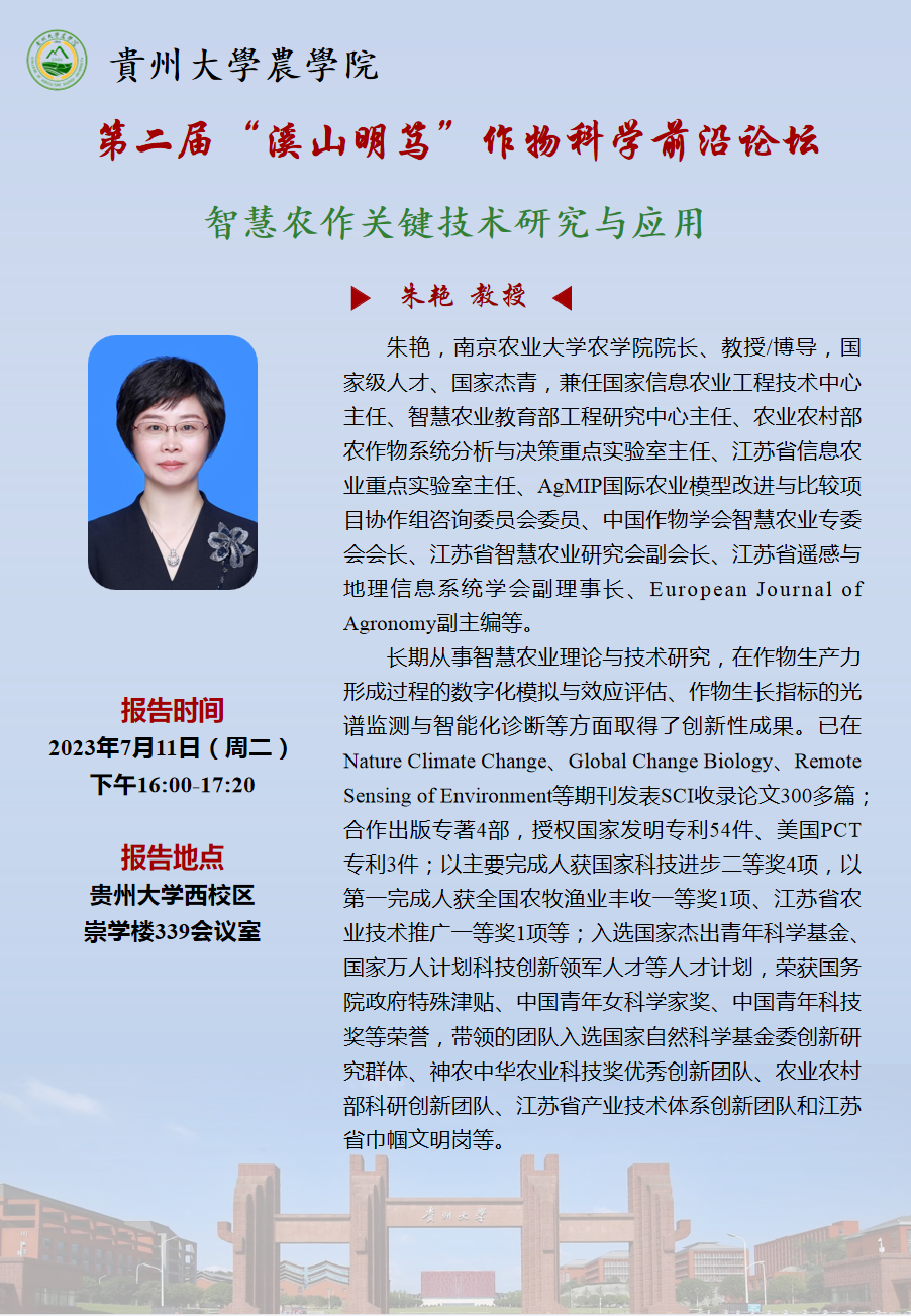 2023年7月11日 第二届“溪山明笃”作物科学前沿论坛:南京农业大学朱艳教授《智慧农作关键技术研究与应用》
