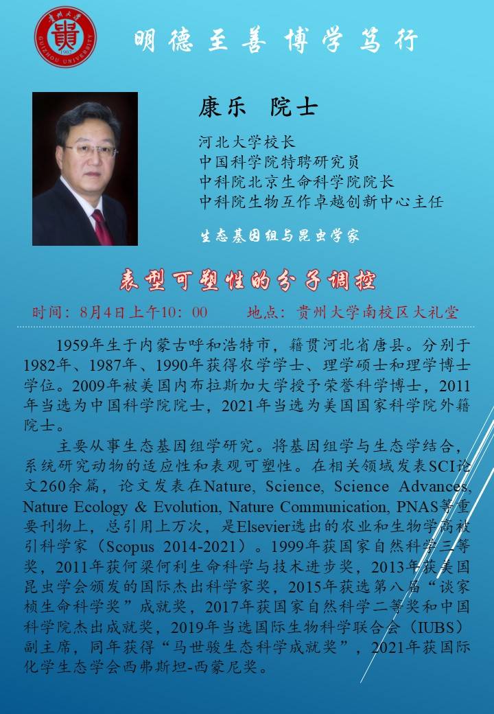 2023年8月4日 河北大学校长、生态基因组与昆虫学家康乐院士《表型可塑性的分子调控》