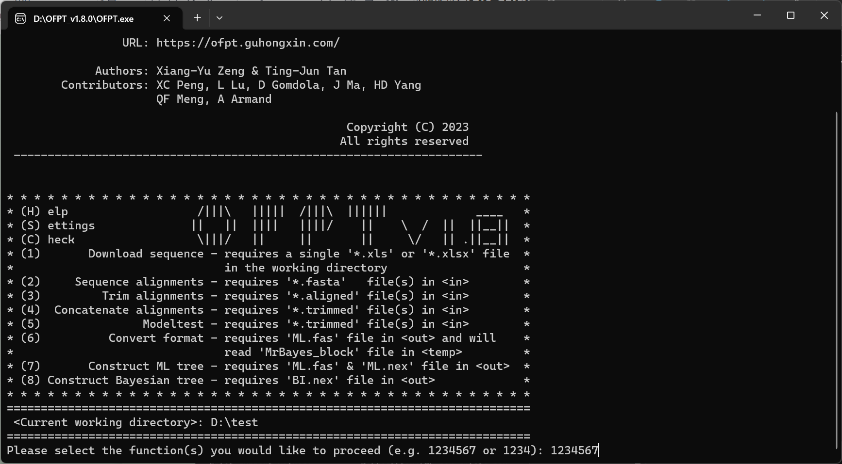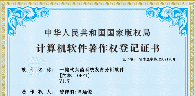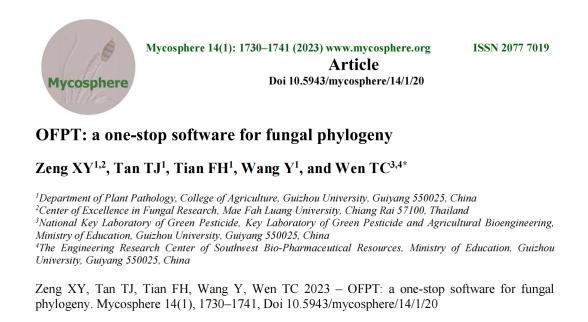 针对现有某些软件能提供部分或全部系统发育分析功能操作频繁、功能过于单一而无法完成整个建树流程等缺陷,88038威尼斯植物病理学科曾祥羽团队开发了“一键式真菌系统发育分析软件”(简称:OFPT)。该软件将构建系统发育树的重复过程自动化和标准化,研究者只需要准备一个带有DNA登录号的Excel文件就可以利用软件自动生成相应的系统发育树。使用该软件将大大提高系统发育分析的效率和系统发育树的可靠性。该成果已获得相应的计算机软件著作权(登记号:2023SR1445017),相关论文发表在了真菌学领域著名期刊Mycosphere(IF=14.6)上。