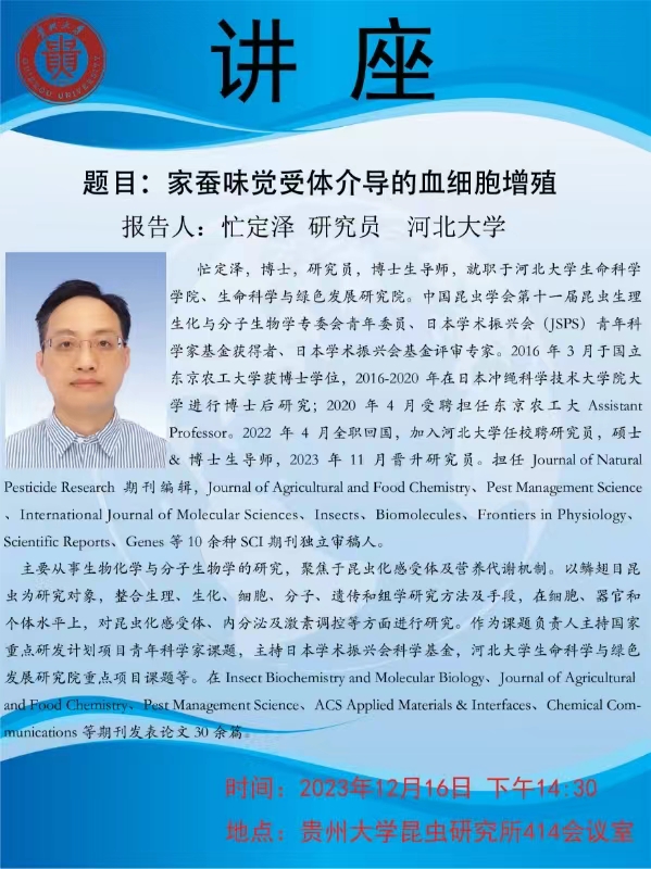 2023年12月16日 河北大学忙定泽研究员讲座《家蚕味觉受体介导的血细胞增殖》