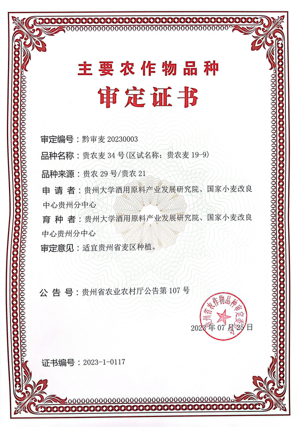 任明见教授团队采用杂交系选法结合分子标记辅助选择技术培育而成的小麦新品系,经过两年省区域试验和一年生产试验,2个小麦新品种[贵农麦33号(黔审麦20230002)、贵农麦34号(黔审麦20230003)]通过2023年贵州省农作物品种审定委员会审定,其中:贵农麦33号为中筋小麦品种,适合面条、面片等面食加工;贵农麦34号为弱筋小麦品种,适合酱酒制曲和制作饼干。截止目前,上述两个小麦品种已在桐梓、正安、惠水、龙里、金沙、大方、纳雍、黔西、贞丰、安龙、开阳、凯里等10余个县进行示范推广,种植面积累计高达8000余亩。