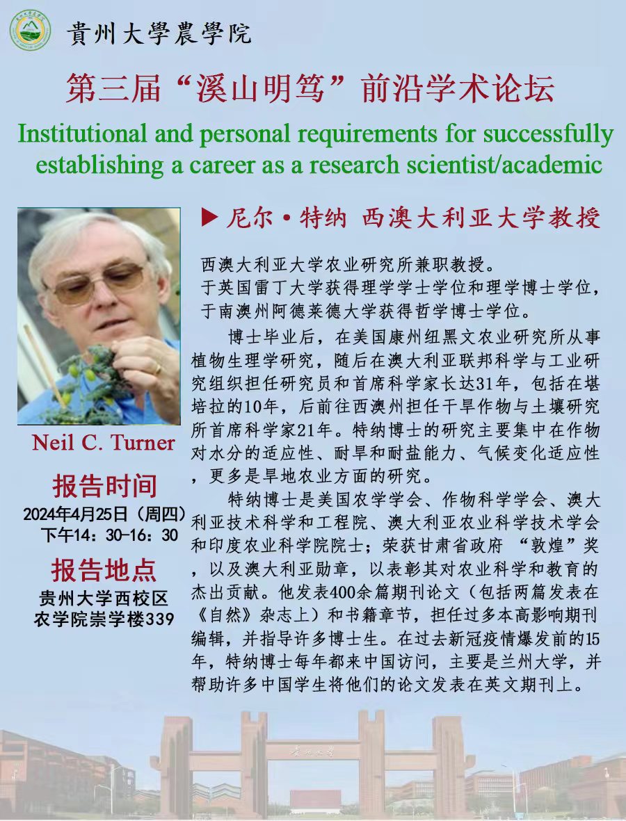 2024年4月25日(周四)西澳大利亚大学尼尔·特纳教授讲座:Institutional and personal requirements for successfully establishing a career as a research scientist/academic