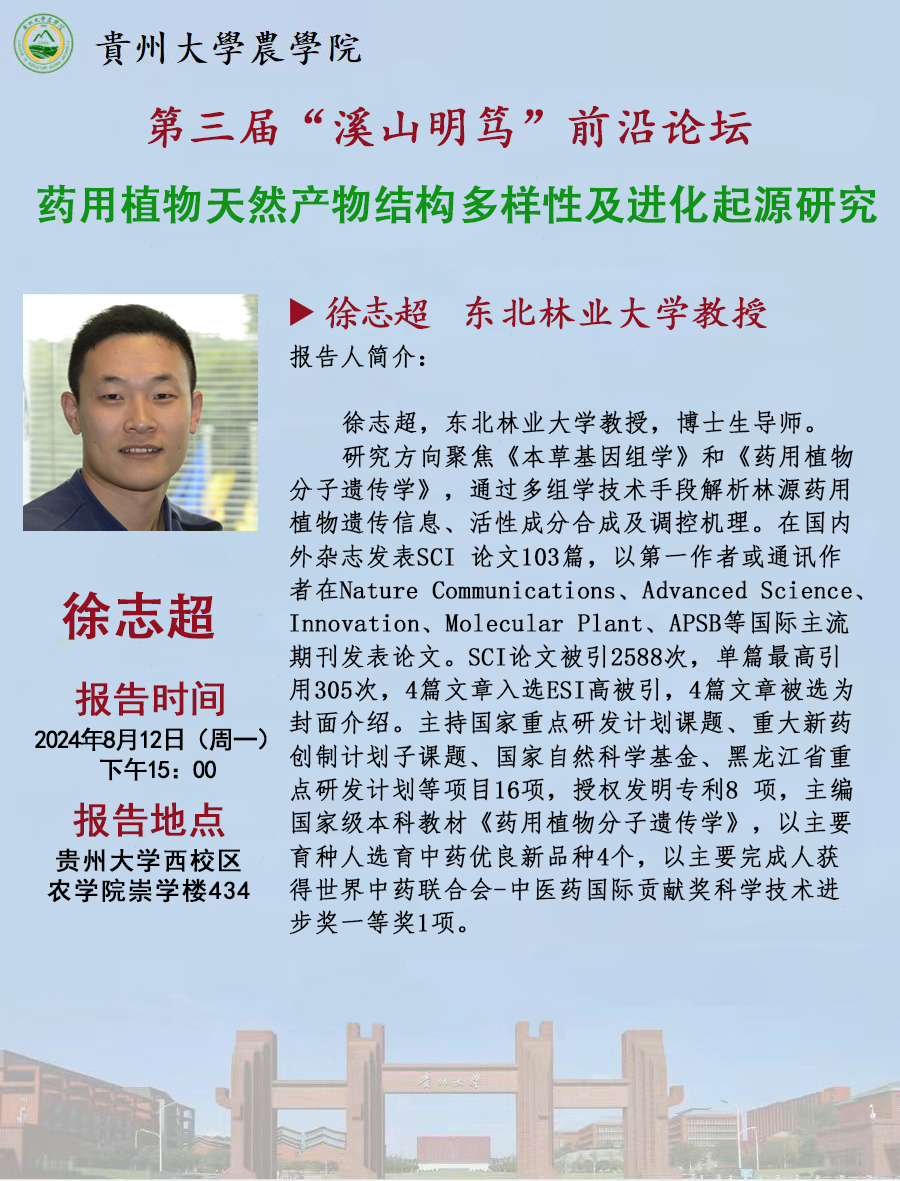 8月12日下午15:00 东北林业大学徐志超教授学术报告《药用植物天然产物结构多样性及进化起源研究》