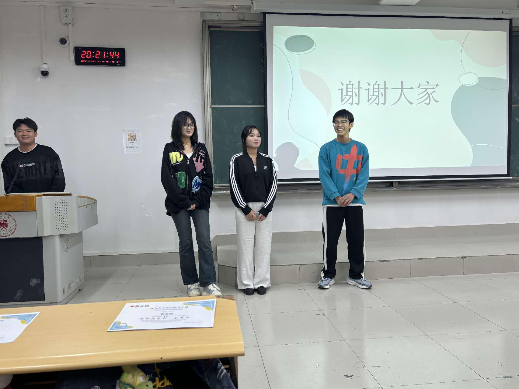 活动开始,主持人简要介绍本次活动流程,并介绍蹇玺杨、刘城、韦寒三位分享人的个人情况。三位同学分别分享了期末复习及四六级备考经验、奖学金评定方法和综测评分细则、盗梦空间APP使用细则以及志愿时长的作用,并对同学们提出的问题进行解答。