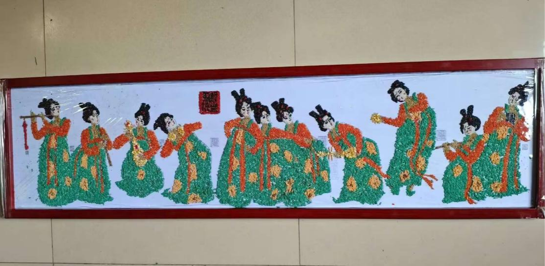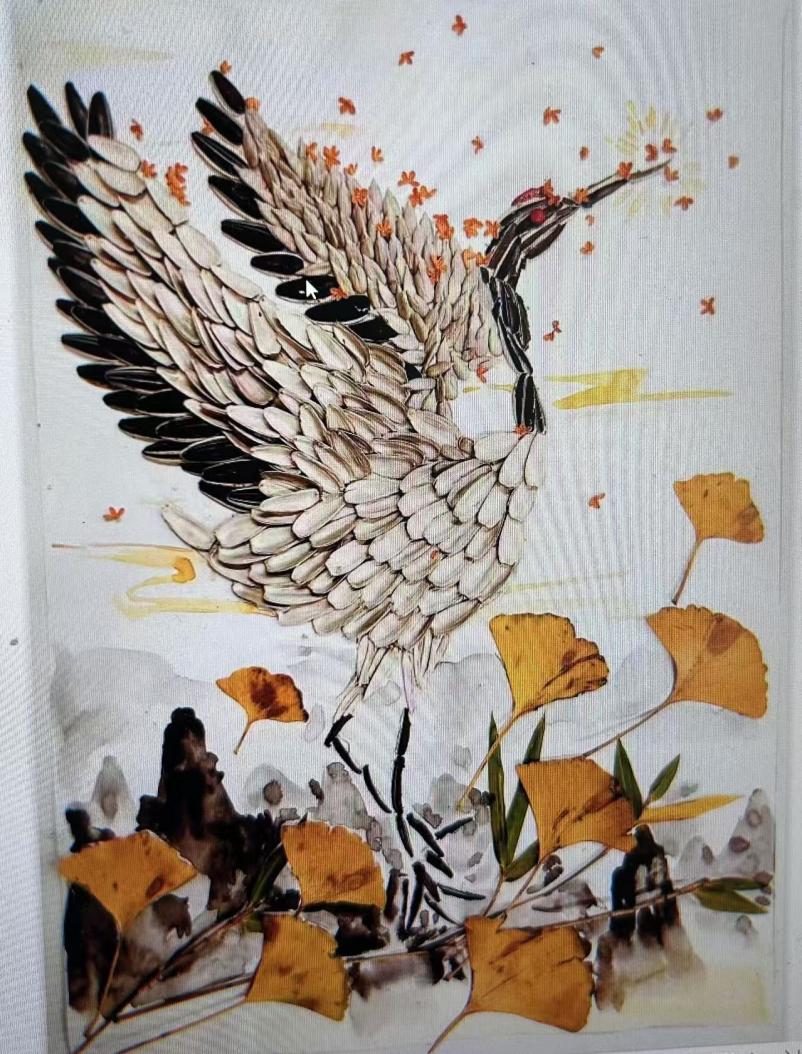 《鹤送金秋》以废弃瓜子壳拼贴出高洁的鹤,于金秋传递吉祥、自由、高洁之意,体现环保与创新融合