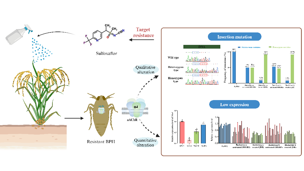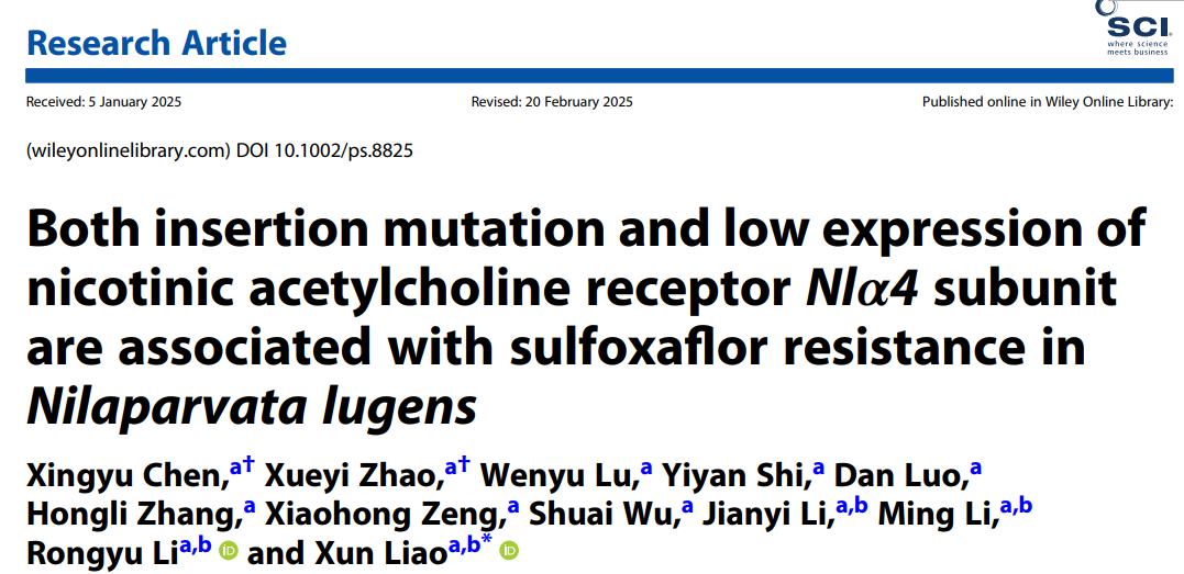 该研究成功克隆了褐飞虱(Nilaparvata lugens)对氟啶虫胺腈敏感和抗性品系中13个烟碱乙酰胆碱受体(nAChRs)亚基的编码序列,发现抗性褐飞虱的Nlα4亚基存在“TGAC”插入突变且下调表达。通过遗传连锁分析和RNAi实验证实,Nlα4亚基的插入突变和低表达均与褐飞虱对氟啶虫胺腈的抗性相关,研究结果为新型杀虫剂的合理设计和褐飞虱抗药性的有效治理提供了理论依据。(原文链接:https://doi.org/10.1002/ps.8825)