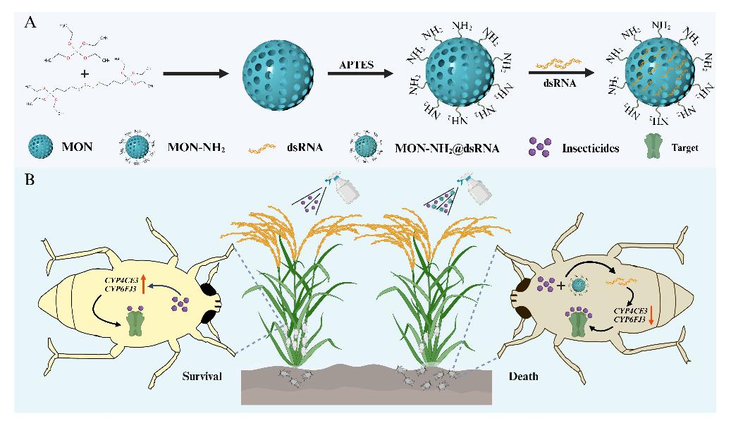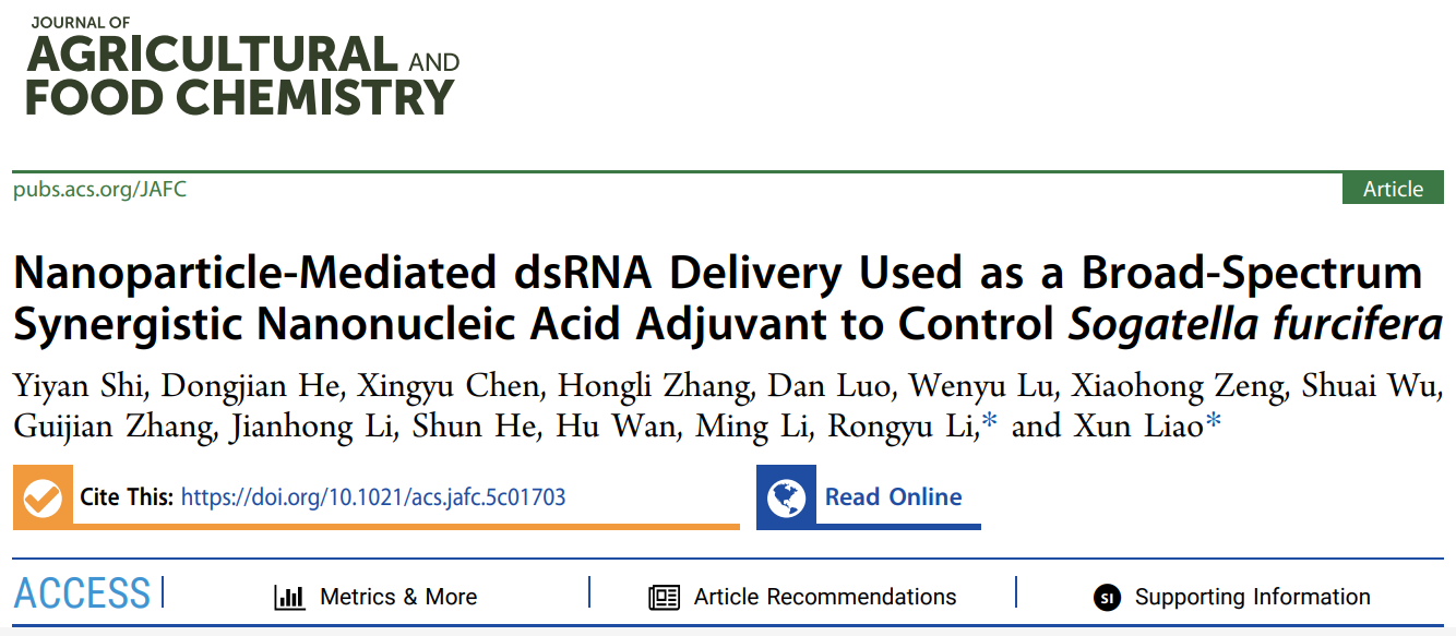 该研究发现细胞色素P450基因CYP4CE3和CYP6FJ3参与白背飞虱(Sogatella furcifera)对多种杀虫剂的解毒代谢过程,通过构建纳米颗粒介导的双链RNA(dsRNA)递送系统MON-NH₂@ch-dsRNA,可有效抑制这两个基因表达,增强白背飞虱对杀虫剂的敏感性,且对非靶标生物家蚕安全性较高,可作为一种新型的纳米核酸增效剂,与杀虫剂配合用于白背飞虱的防治,为农业害虫的绿色高效治理提供了新途径和理论依据。(原文链接:https://doi.org/10.1021/acs.jafc.5c01703)