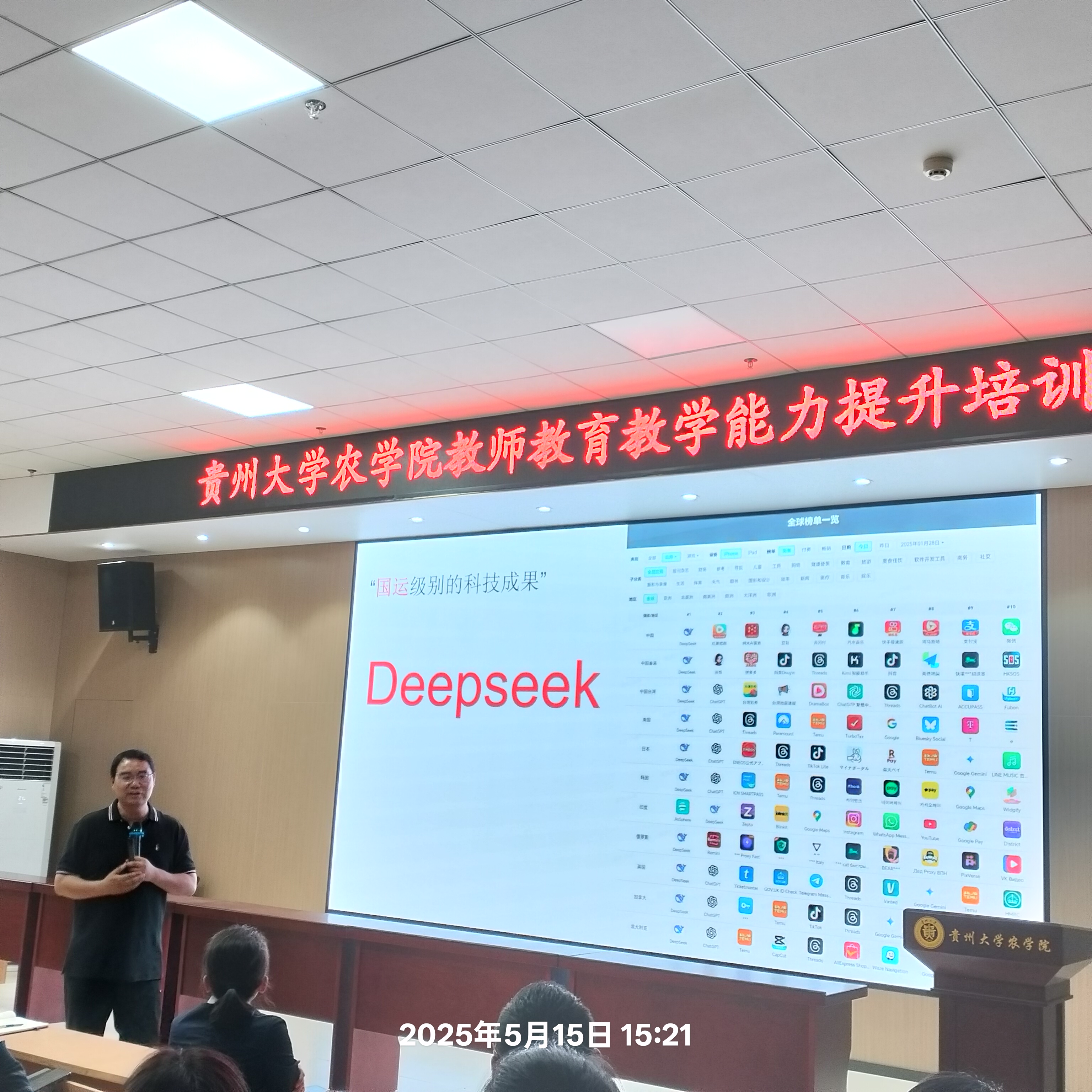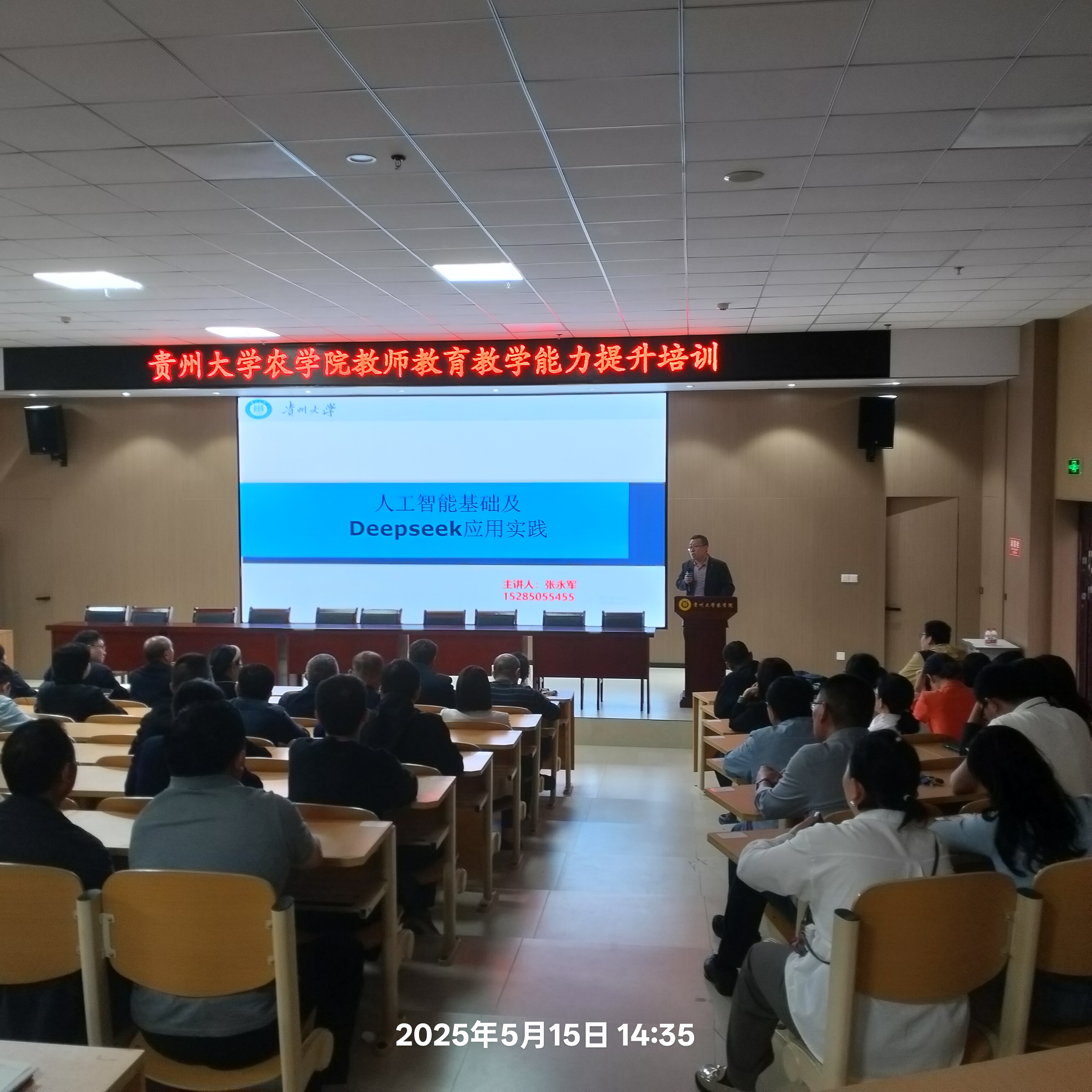 李鲁华代表学院对张永军博士的到来表示热烈欢迎。随后张永军博士从人工智能国家战略及关键技术、Deepseek技术创新及应用、Deepseek+教研赋能、Deepseek+智慧农业四个方面进行了精彩的讲解,重点演示了Deepseek常用的七种提示词模板、随机点名、表格生成、图形绘制、PPT制作、综述撰写等与涉农学科教育科研密切相关的技术。