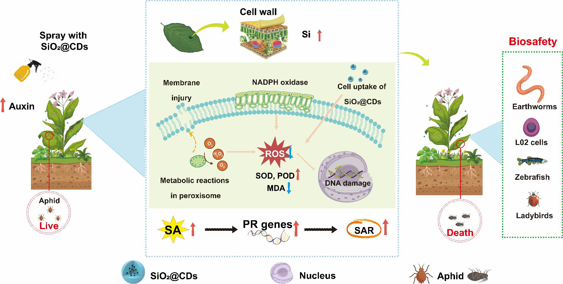 团队基于当前植物诱导抗性策略存在稳定性差、持续作用短等局限,采用溶胶-凝胶法合成了二氧化硅包覆碳量子点复合材料(SiO2@CDs),并系统评估其在烟草抗蚜虫过程中的防控效果与机制。研究发现,SiO2@CDs可有效提升烟草的生长性状与抗蚜能力。机制研究表明,该材料不仅通过硅增强植物物理防御,还能显著提高水杨酸等防御激素水平,激活抗氧化酶活性,减轻蚜虫诱导的氧化胁迫。