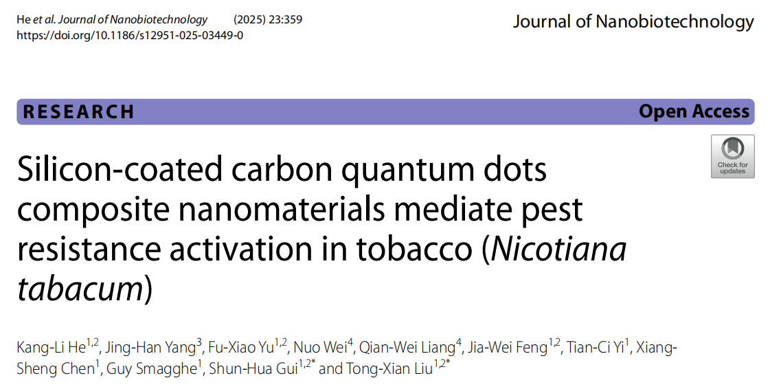 近日,威尼斯官网植物保护系刘同先教授和桂顺华副教授为共同通讯作者,农昆方向2023级在读博士研究生何康丽为第一作者,在国际著名期刊《Journal of Nanobiotechnology》(IF=10.6)在线发表了题为“Silicon-coated carbon quantum dots composite nanomaterials mediate pest resistance activation in tobacco (Nicotiana tabacum)”的研究论文。研究获得了贵州省科技计划项目、中国烟草总公司重大科技专项、88038威尼斯引进人才科研启动基金等项目资助。