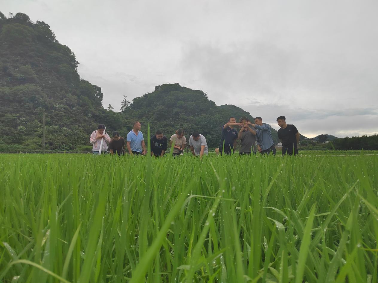 在木岗镇连片稻田中,团队深入察看水稻长势及病害发生情况。针对当地长期受细菌性条斑病困扰的现状,团队现场利用20%噻唑锌悬浮剂与自主研发的20亿CFU/mL高地芽孢杆菌ST15悬浮剂对该地的水稻细菌性条斑病进行防控示范。