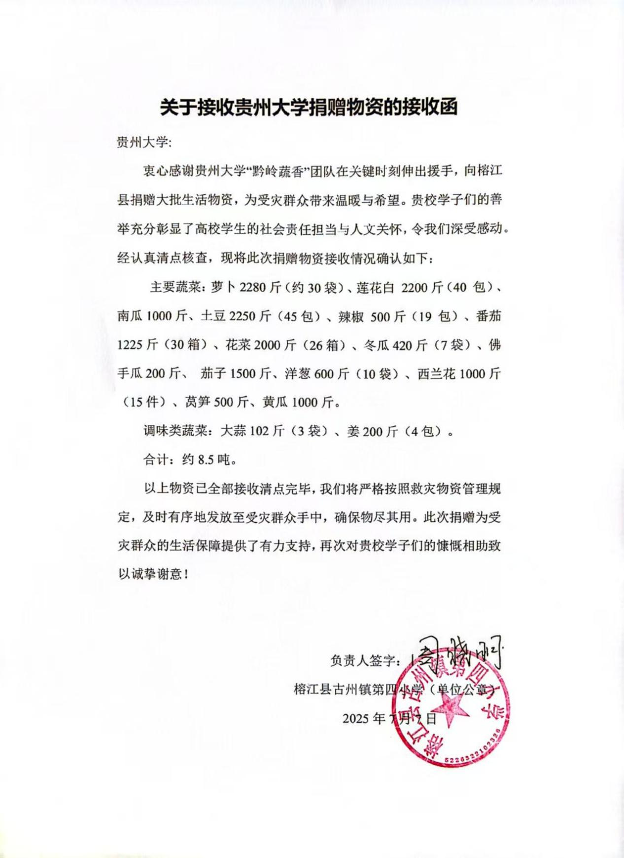 连夜支援,师生齐心传递温暖。6日晚,由陈竹、徐秀红两位老师带领的10人师生团队,从花溪驱车赶往榕江。一袋袋蔬菜沉甸甸的,承载的是贵大师生对灾区群众满满的关怀。萝卜、南瓜、土豆、辣椒、西兰花…… 共计15种、超过万斤的新鲜蔬菜,以及急救药品,被有序码放整齐,为后续救灾工作筑牢基础。