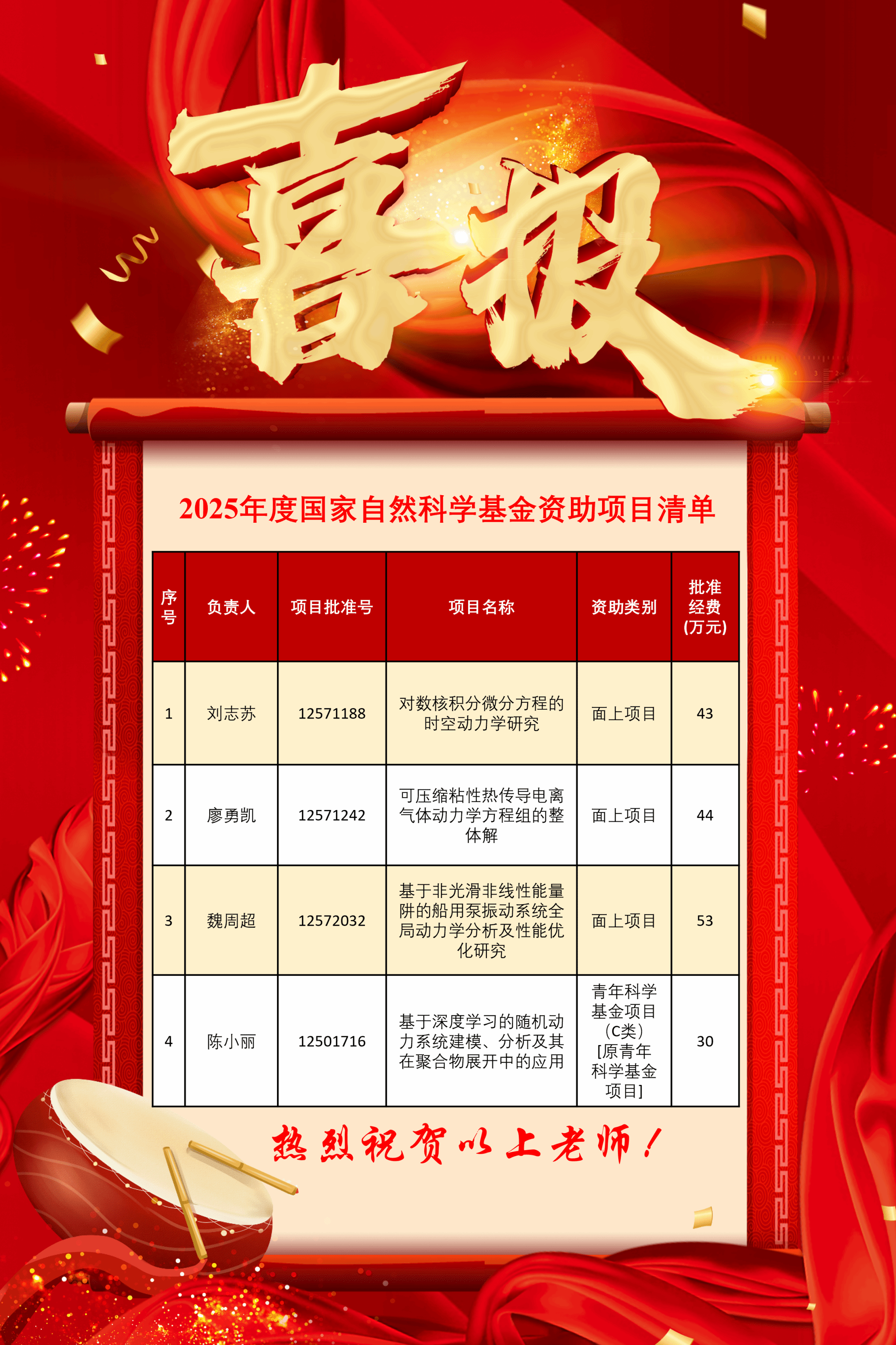 2025年8月27日,国家自然科学基金委员会公布了2025年集中接收期项目评审结果,beat365官网共有4项项目获得立项资助,其中面上项目3项、青年科学基金项目(C类)[原青年科学基金项目] 1项。