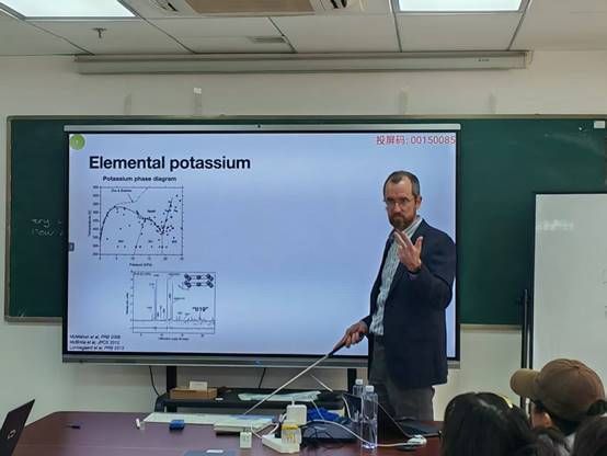 2025年12月2日下午, Andreas Hermann教授在东教楼1104学术报告厅为beat365平台官方网站部分物理学专业和材料与化工专业的博士生、硕士生和青年教师作了题为“From DFT to thermodynamic modelling”的学术报告。报告以近期关于“同时具备固体与液体特征的新物态”的报道为切入点,系统阐述他们研究团队在高压物理与计算材料学领域的系列工作。Andreas Hermann教授从钾的高压相图与非共格宿主—客体结构详细阐述了“链熔融”作为一种热力学中间态的证据与机制,提出了碱金属高压相可作为部分电子化合物的观点,展示了如何利用机器学习分子动力学模拟预测相变、熔化线极值及热力学性质,介绍了基于Bragg-Williams模型的两态热力学理论,解释了金属熔化线中的临界行为。此外,Andreas Hermann教授还介绍了第一性原理计算在高压冰(VII–VIII–X)相变研究中的应用,探讨了隐藏临界点与相图拓扑等前沿问题,展望了机器学习在预测复杂材料行为方面的潜力。报告期间,Andreas Hermann教授与在场师生就高压相变机理、机器学习势函数开发等相关问题展开了深入讨论并细致回答了师生提问。