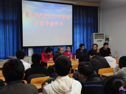 11月29日下午四点,beat365平台官方网站2010年秋季院领导接待日活动在数理楼二楼会议室举行。院领导班子全体成员和2010级本科生与会参加。在活动过程中,院领导班子成员就同学们关心的诸如专业学习、考研就业和日常生活等问题进行耐心回答。院领导接待日是学院领导与广大同学沟通交流的重要渠道,在解答同学们学习和生活中众多疑惑的同时,有利于增进师生之间的相互了解,促进学院服务管理水平的改善提高。