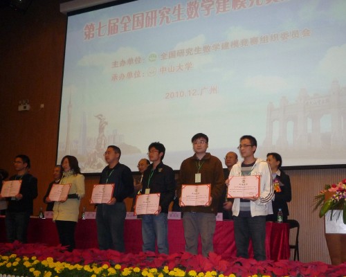 2010年9月17日,全国第七届研究生数学建模竞赛颁奖仪式在广州中山大学举行。beat365平台官方网站院长刘安平教授、副院长彭放教授,校研工部李红丽副部长以及4名一等奖获得者参加此次活动。