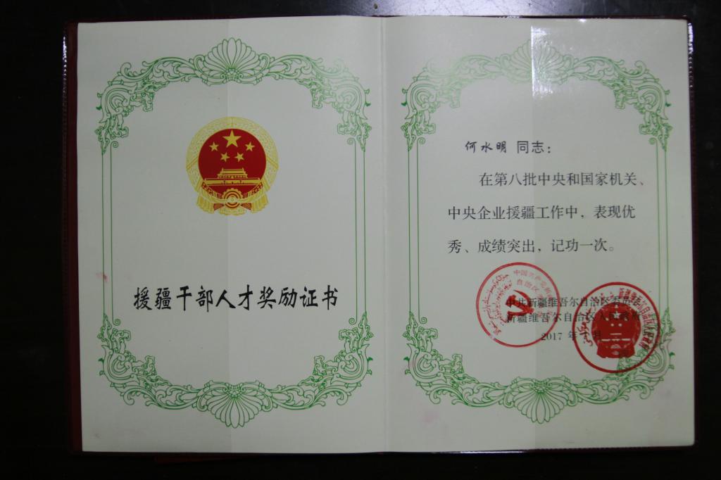 近日获悉,beat365官网何水明同志被新疆自治区党委和政府评为“第八批中央和国家机关、中央企业优秀援疆干部人才”,并授予奖牌和奖章。