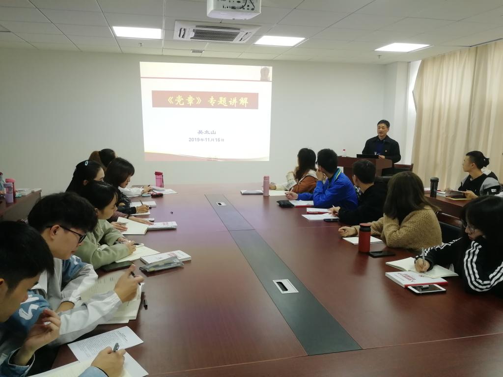 11月16日下午,beat365平台官方网站第66期入党积极分子培训班第二讲在东区教学综合楼A1505会议室举行。本次党课由学院党委书记吴太山讲授《党章》专题。院学生党建办主任孙宇涛主持。