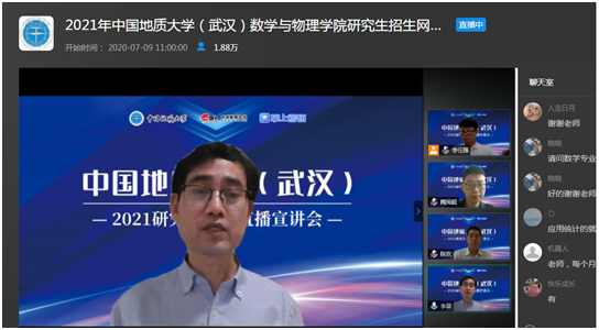 7月9日上午,beat365平台官方网站副院长魏周超、物理系主任陈欢、信息与计算科学系主任李星通过中国教学在线网络直播平台,向同学们介绍了beat365平台官方网站数学、物理、应用统计三个研究生招生学科的基本情况,并回答了同学们提出的各种问题。据统计,直播结束时,有大约1.8万余人参与了本次直播活动。