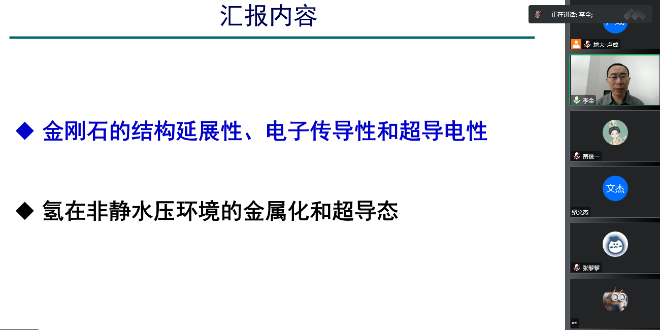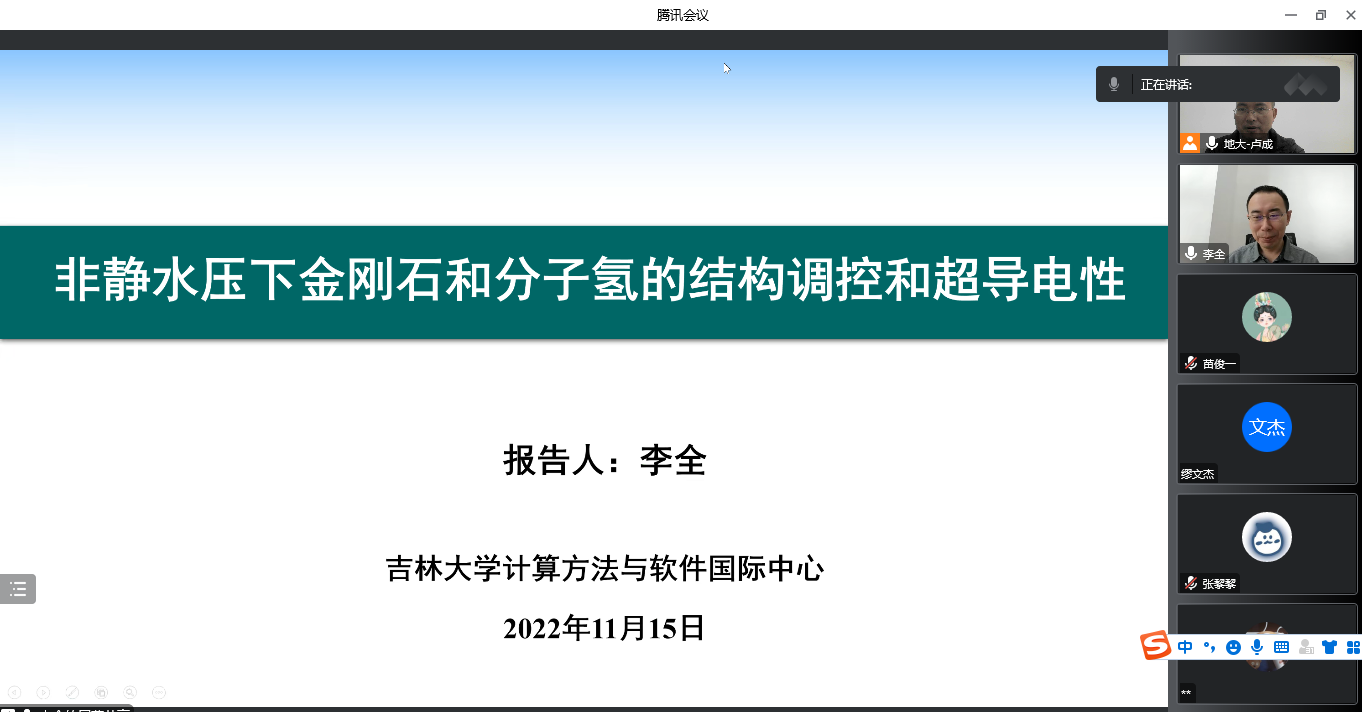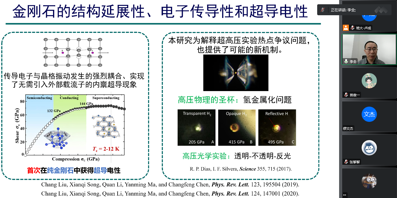为迎接我校七十周年校庆,11月15日上午,beat365平台官方网站通过线上的方式,邀请吉林大学计算方法与软件国际中心李全教授,为我校物理系师生做了题为《非静水压下金刚石和分子氢的结构调控和超导电性》的学术报告。该报告由我校科学技术发展院、beat365平台官方网站联合举办,卢成教授主持,本院师生共计60余人参加。