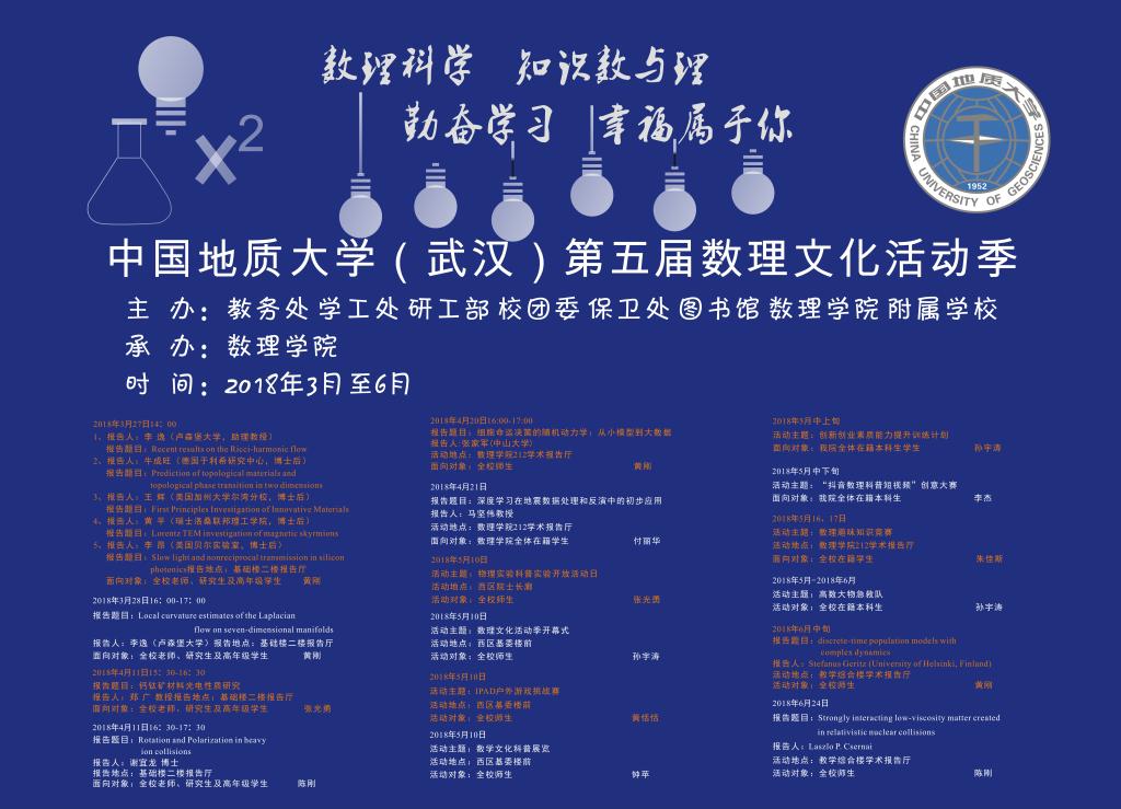 中国地质大学(武汉)第五届数理文化活动季在2018年3月到6月举行。5月10日14:30在西区beat365平台官方网站楼前举行户外物理实验科普展暨数理文化活动季开幕式。