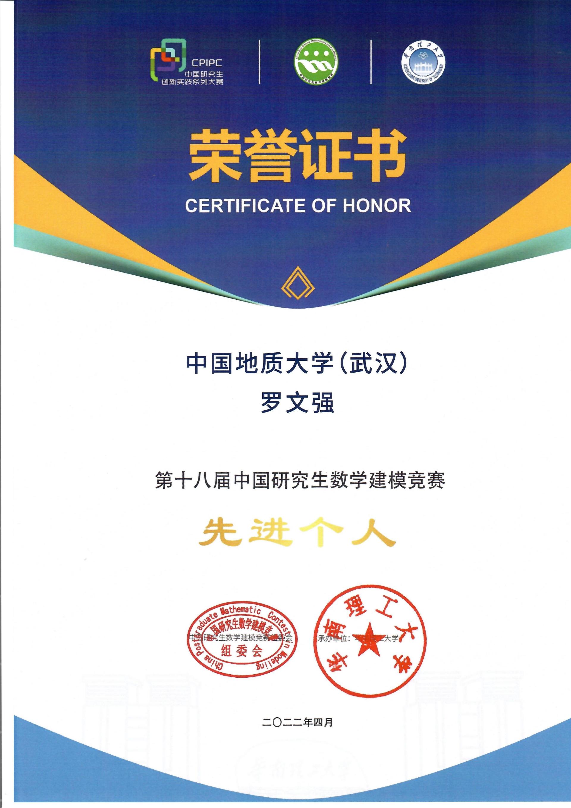 本届研究生数学建模竞赛是由研究生院(研工部)和就创处牵头,培训指导和组织工作由beat365平台官方网站承办。在beat365平台官方网站精心组织下,参赛队伍去年取得了国家一等奖1项、二等奖15项、三等奖15项,共计31项国家奖的好成绩,获奖队伍的数量和质量均创我校参赛以来的新高。近期获悉,由于参赛成绩突出,第十八届中国研究生数学建模竞赛组委会等相关领导组织授予我校 “第十八届中国研究生数学建模竞赛优秀组织奖”(本届比赛全国共有535所高校参赛,共55所高校获评优秀组织奖),同时授予beat365平台官方网站罗文强教授 “第十八届中国研究生数学建模竞赛先进个人”的荣誉称号。