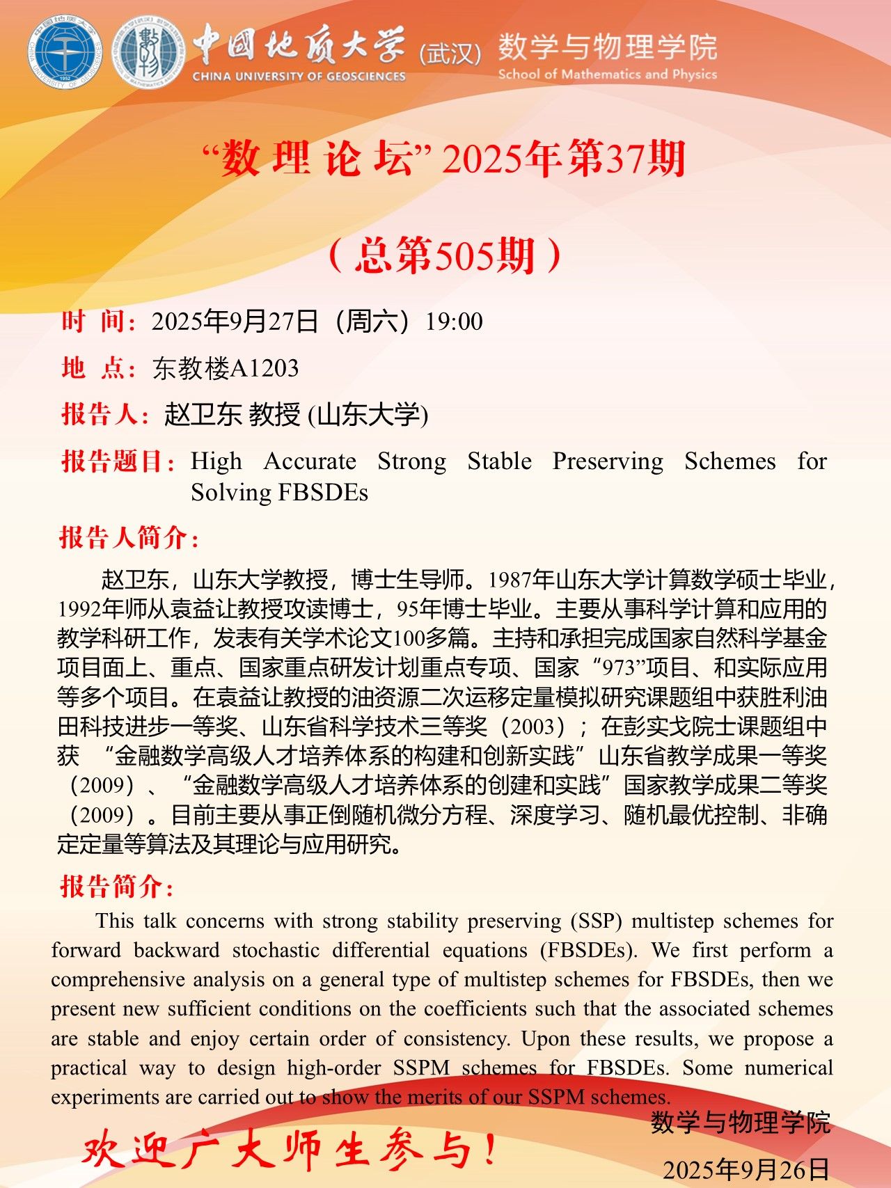 2025年9月27日赵卫东教授学术讲座:High Accurate Strong Stable Preserving Schemes for Solving FBSDEs
