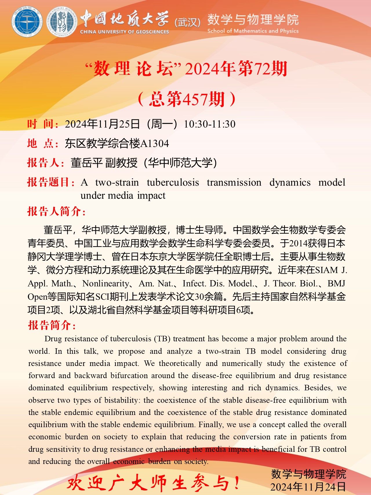 2024年11月25日董岳平副教授学术讲座:A two-strain tuberculosis transmission dynamics model under media impact