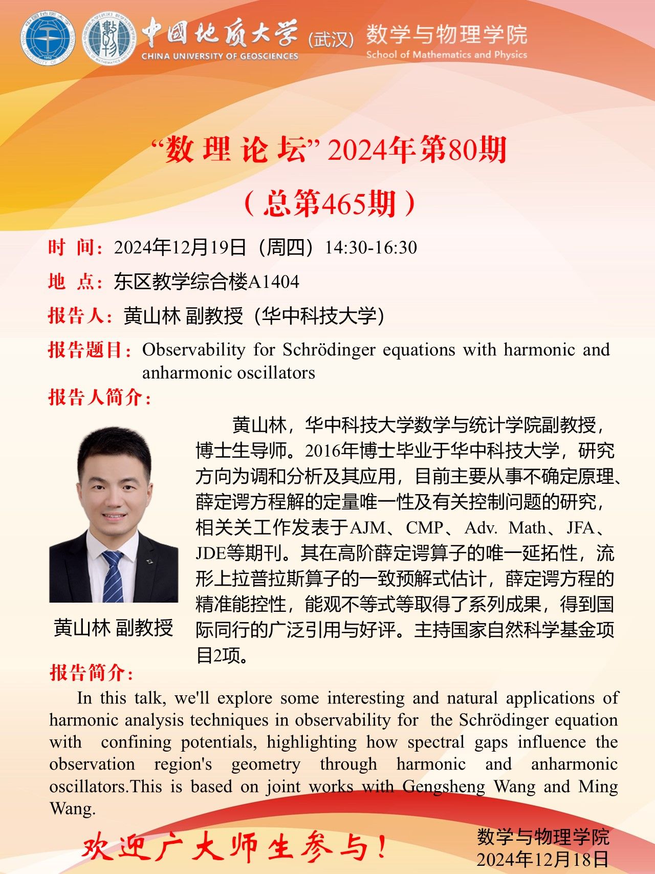 2024年12月19日黄山林副教授学术讲座:Observability for Schrödinger equations with harmonic and anharmonic oscillators