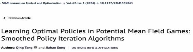 beat365官网信息与计算科学系教师汤庆博士作为通讯作者的工作 “Learning Equilibria in Cournot Mean Field Games of Controls” 最近发表于SIAM Journal on Control and Optimization。