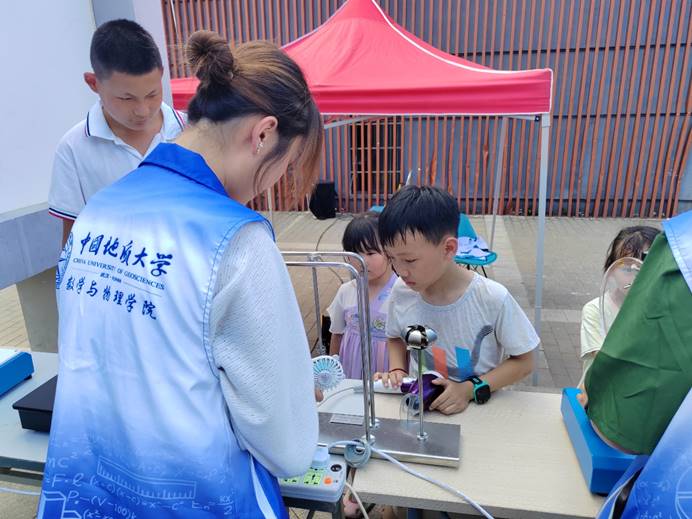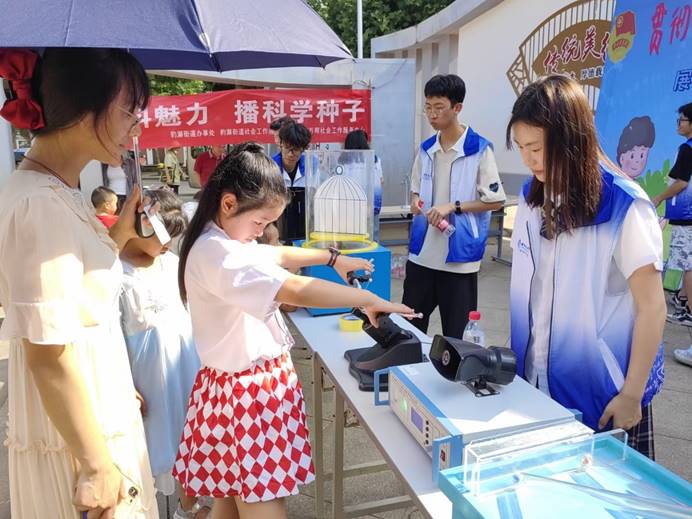 师生志愿者携带远程充电、闪光灯演示电容储能、磁悬浮马达、角动量守恒演示仪、记忆合金、转动惯量演示、穿墙而过、视觉暂留—笼中鸟、动画原理、椎体上滚等十余件科普实验仪器,顶着炎炎烈日与中小学生耐心交流,指导中小学生学习物理实验仪器。街道近百余名中小学生享受了此次科学盛宴。豹澥街道团工委、豹澥街社工站、九龙湖社区对此次活动表示高度赞扬和认可。同时豹澥街愿意创造条件,欢迎地大师生及志愿者们将更多公益科普活动带到豹澥街。