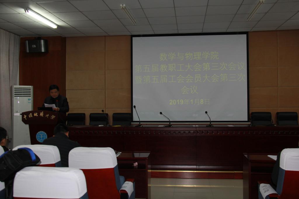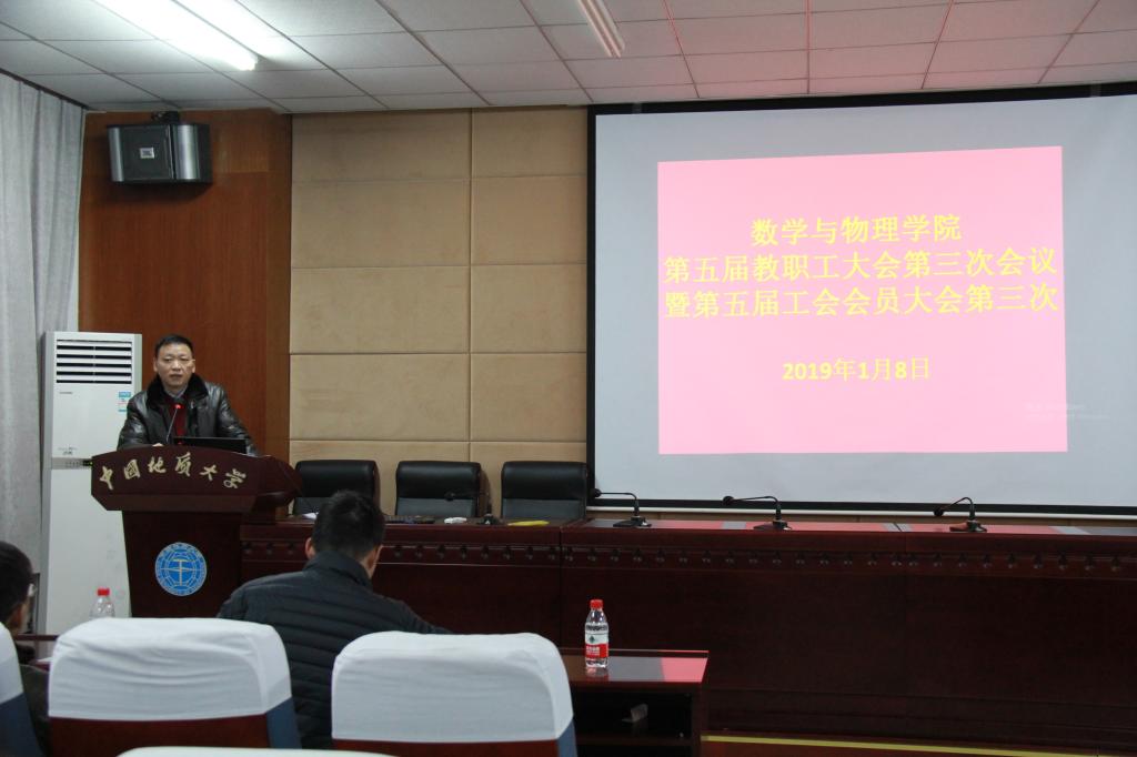 2019年1月8日下午,beat365平台官方网站第五届教职工大会第三次会议暨工会会员大会第三次会议在学海楼109会议室隆重召开。校党委副书记王林清、校工会常务副主席喻芒清应邀出席大会,学院党政领导及全体教职工参加会议。大会分两阶段进行。