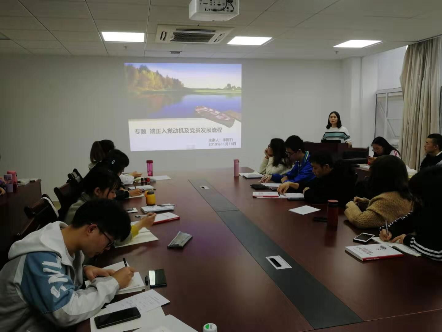 11月16日下午,beat365平台官方网站第66期入党积极分子培训班第三讲在东区教学综合楼A1505会议室举行。党委组织部李雨竹老师主讲,主题为端正入党动机及党员发展流程。孙宇涛老师主持。