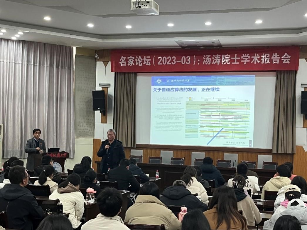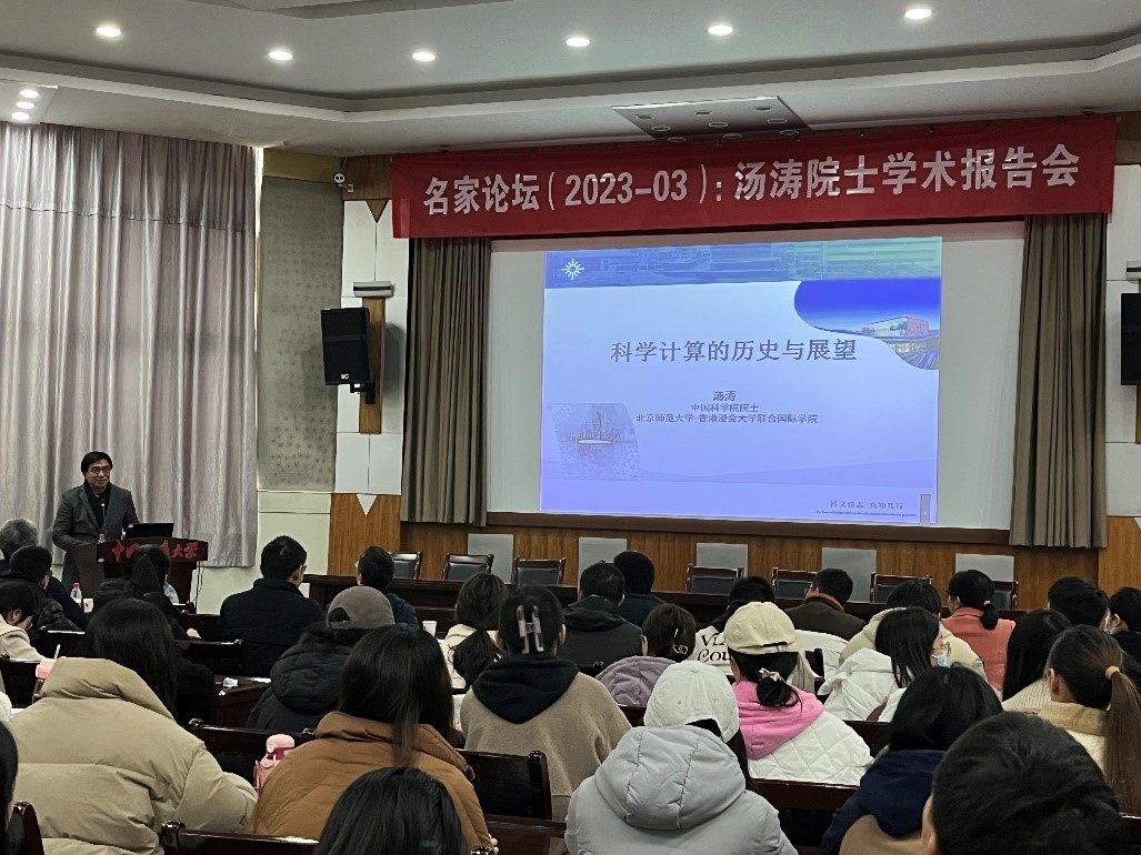 应beat365平台官方网站院长郭上江教授邀请,北京师范大学-香港浸会大学联合国际学院汤涛院士于2023年2月18日上午在南望山校区八角楼学术报告厅与beat365官网师生进行学术交流,并作题目为:“科学计算的历史与展望”的学术讲座,校内外100多名师生参加了本次学术讲座。报告会由院长郭上江教授主持。