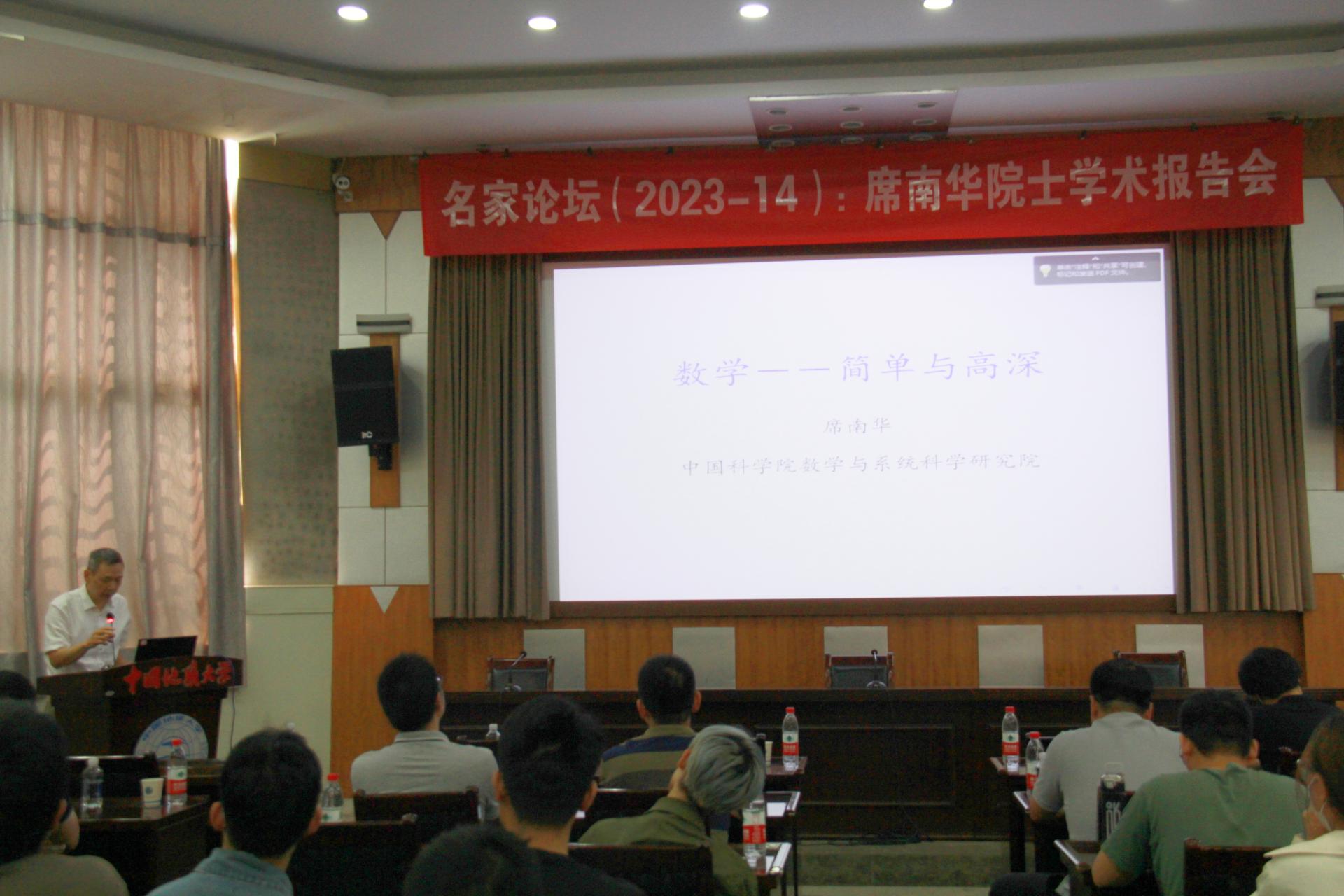 2023年5月27日,中国科学院院士、中国科学院数学与系统科学研究院研究员、上海科技大学副校长席南华教授应邀做客中国地质大学(武汉)名家论坛,在南望山校区八角楼学术报告厅作了题为“数学—简单与高深”的学术讲座。报告会由院长郭上江教授主持。