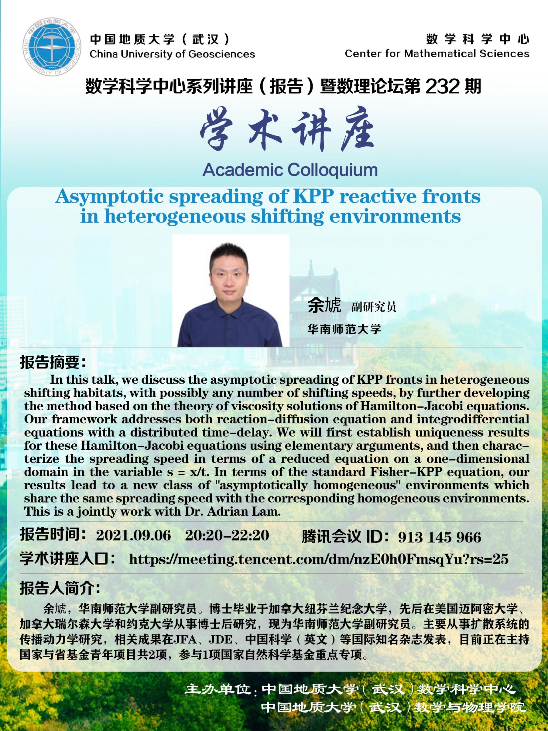 "数理论坛"第232期暨数学科学中心系列讲座(报告):Asymptotic spreading of KPP reactive fronts in heterogeneous shifting environments